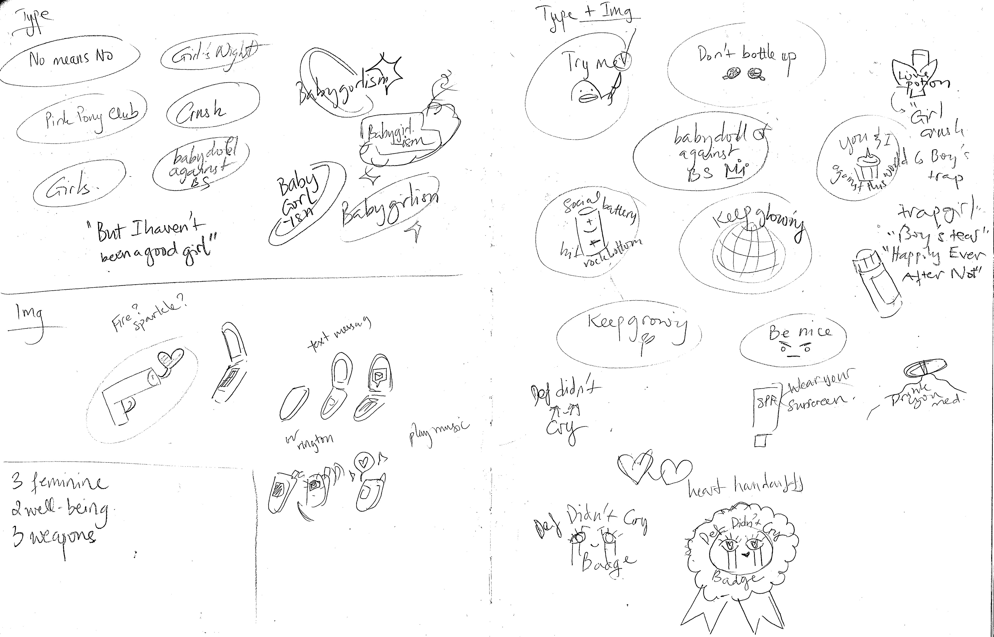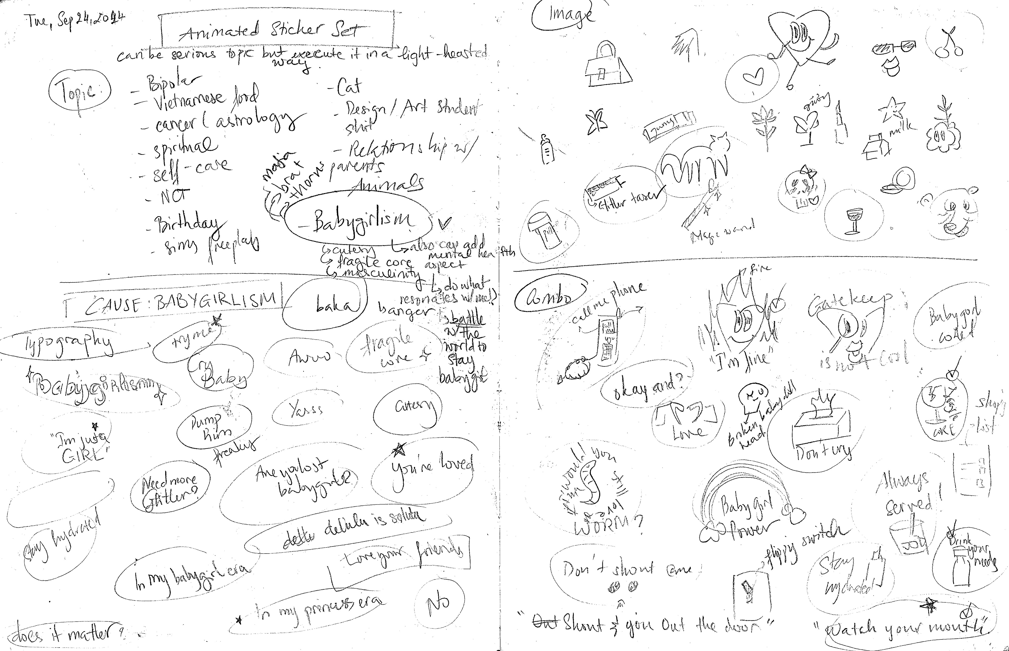 The stickers are categorized into three main groups: Type-dominant, Image-dominant, and Type + Image. I began this project by first designing the flat versions of the stickers and then adding animations later. Initially, the color palette included neon blue, pink, purple, and yellow. However, these colors did not effectively convey the "tough" aspect of the "Babygirl" theme, so I chose a new palette featuring pink, white, and black instead.