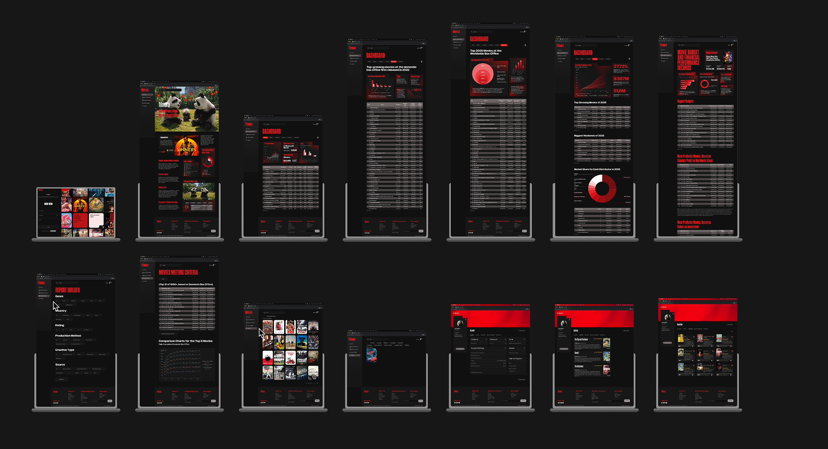 Our design system draws on cinematic visuals: a bold red palette inspired by theater energy, contrasted with deep blacks and muted greys. We paired Dharma Gothic for striking headings with Owners for clarity and readability, echoing the drama of film posters with a modern touch.