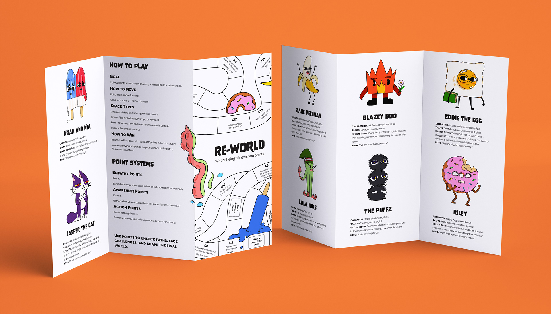 The accompanying Tri-Fold Brochure introduces the cast, rules, and point system, serving as a quick-start guide to the world. Re-World is more than a game. It’s a creative tool for sparking early empathy, reflection, and social awareness through laughter and choice.