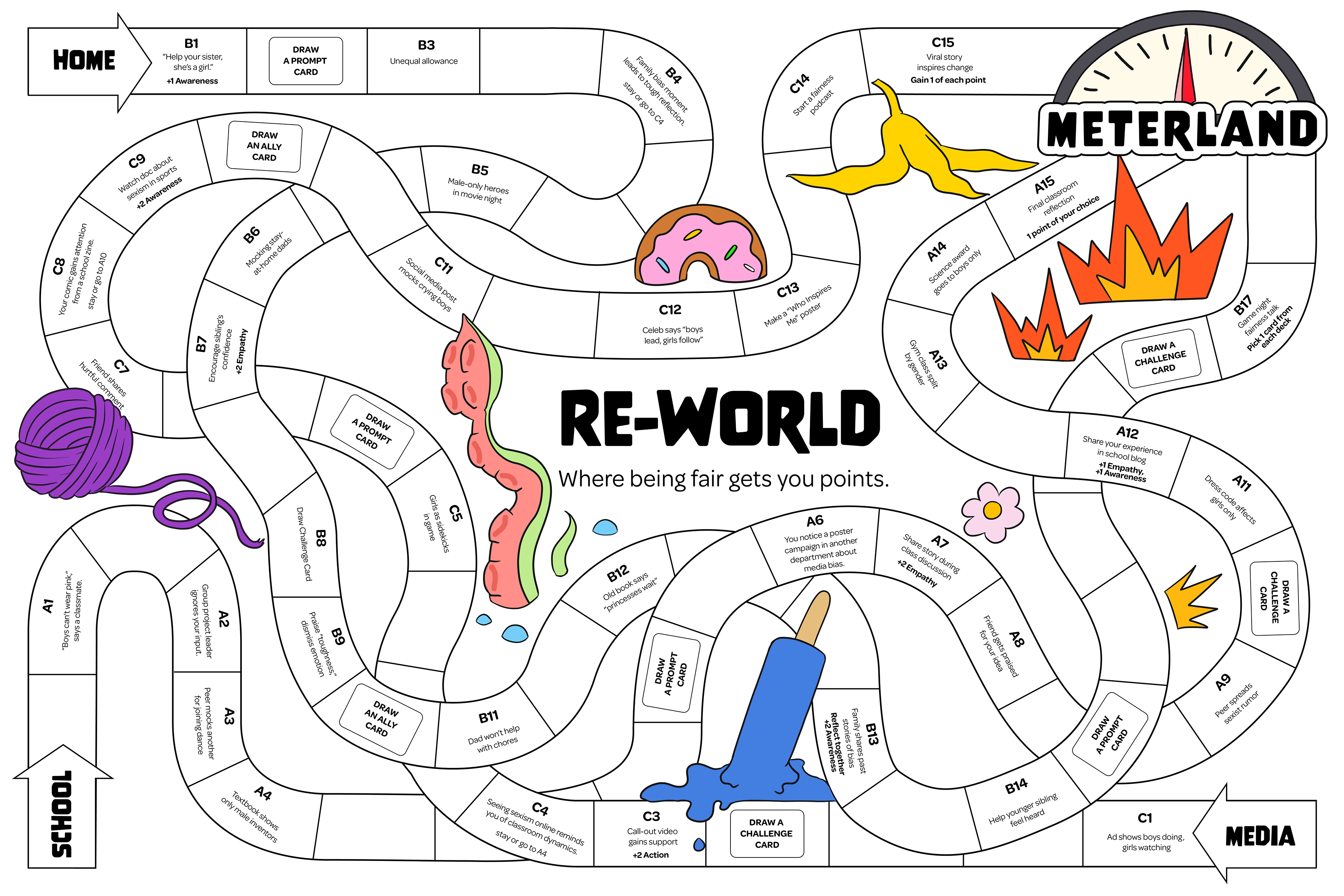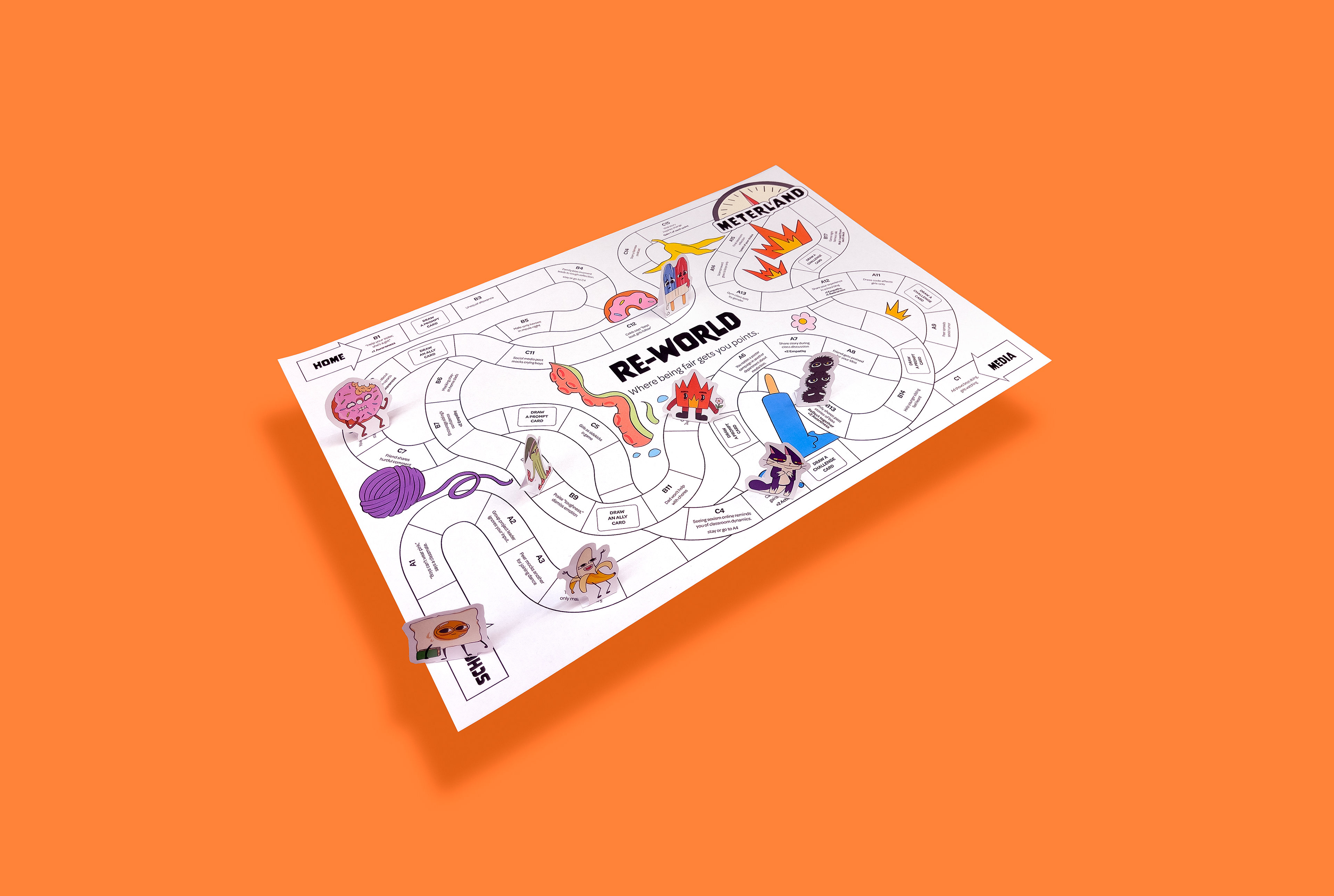 Re-World became a board game for preteens that makes critical thinking about gender roles engaging, funny, and accessible. Players collect Empathy, Awareness, and Action Points while navigating zones like School, Family, and Media. Their combined choices determine the ending: Fair World, Wobbly World, or Backwards Land, a reflection of how individual actions shape collective outcomes.